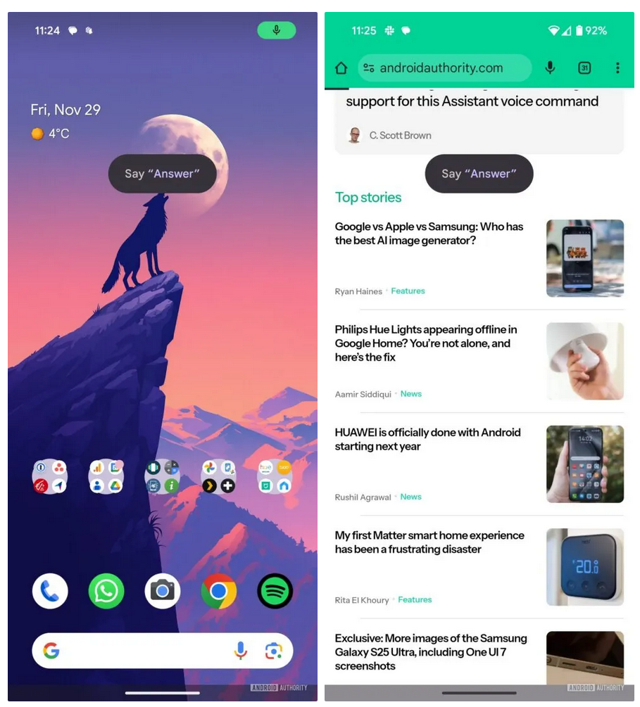 IT之家注:这是 Google Assistant 的 Quick Phrases 功能之一,用户可以通过说“Answer”,不需要常规的“Hey Google”唤醒词,就能接听来电,用户也可以说“Decline”短语直接拒绝来电。