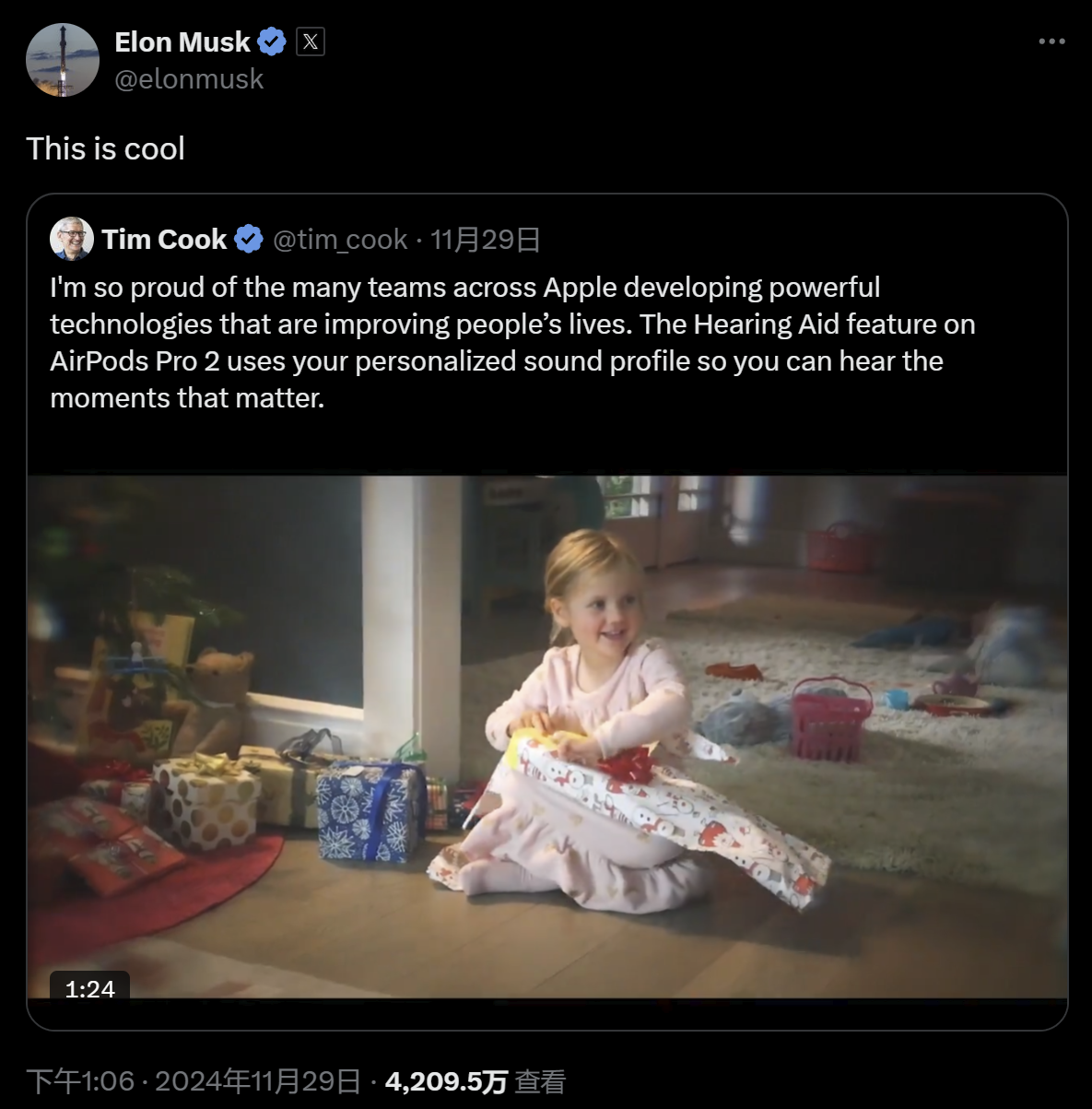 苹果公司首席执行官蒂姆-库克周四分享了一则助听器广告,广告中一位患有听力损失的父亲使用 AirPods Pro 2 助听器听到女儿打开圣诞礼物的声音。 对此,埃隆-马斯克表示:"这很酷。"