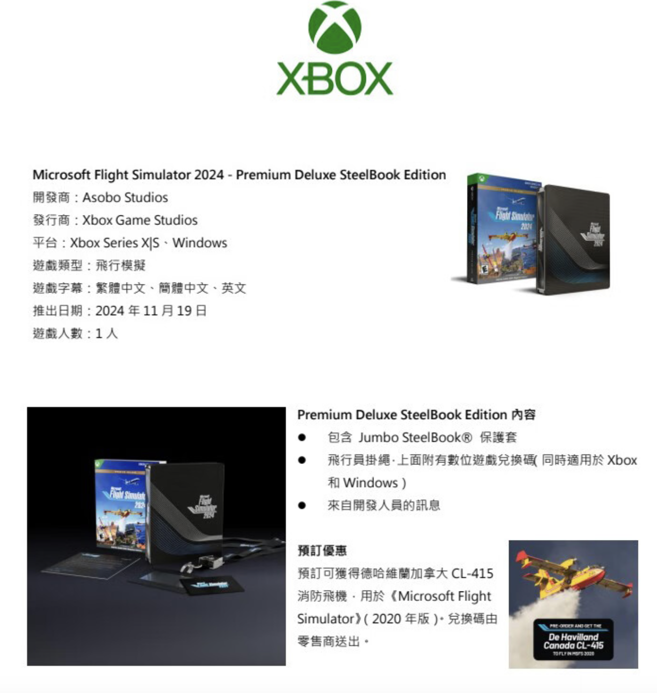 据介绍,铁盒版《微软模拟飞行 2024》包含“Jumbo SteelBook 保护套“、”飞行员挂绳”、“来自开发人员的问候”,但没有提供实体游戏安装介质,仅提供了游戏兑换码。