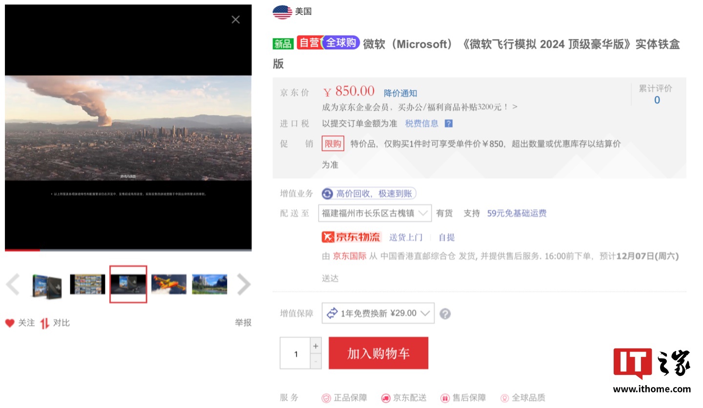 IT之家 12 月 1 日消息,京东国际直营现已上架《微软模拟飞行 2024 高级豪华版(Microsoft Flight Simulator 2024 - Premium Deluxe Edition)》实体铁盒版(商品页面显示为《微软飞行模拟 2024 顶级豪华版》),定价为 850 元,将从京东香港直邮综合仓发货。