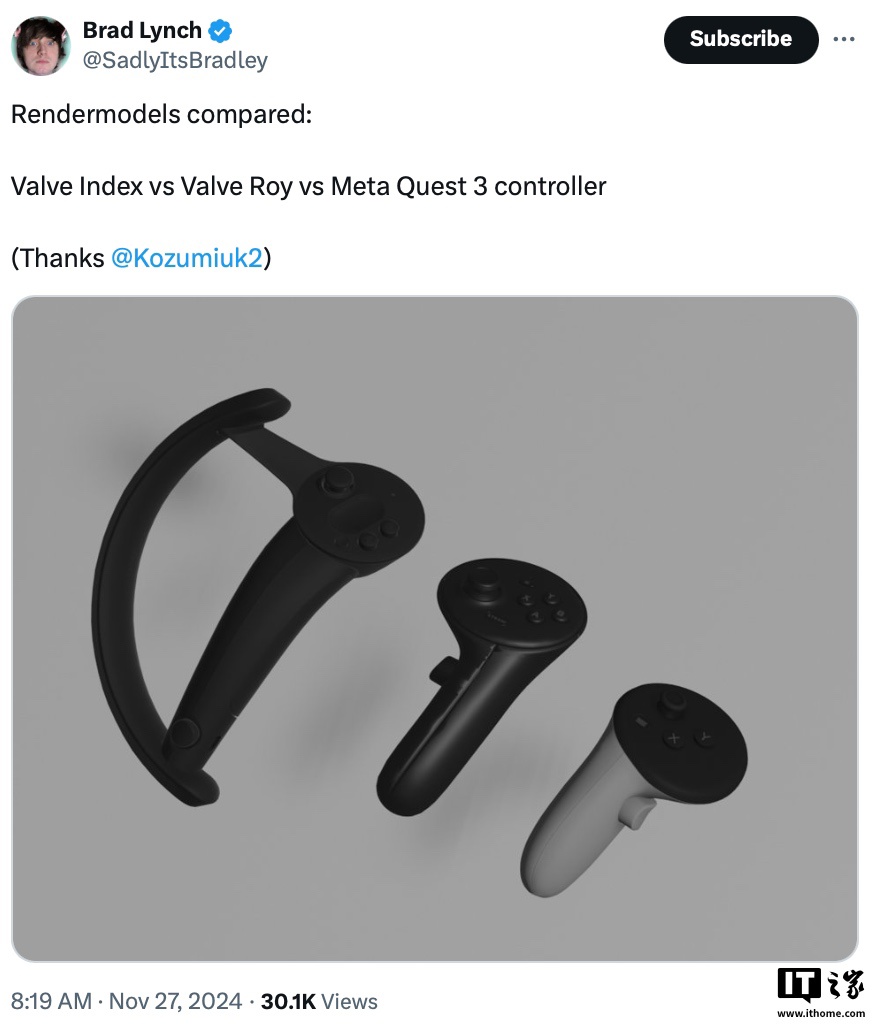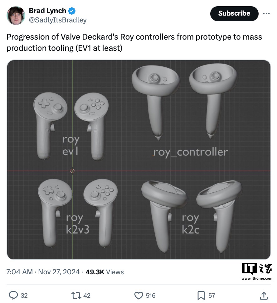 IT之家 12 月 1 日消息,数据挖掘者 Brad Lynch 在 V 社最新的 Steam VR 软件包中发现了新款头显的代码应用及对应控制器手柄“Roy”的 3D 模型。