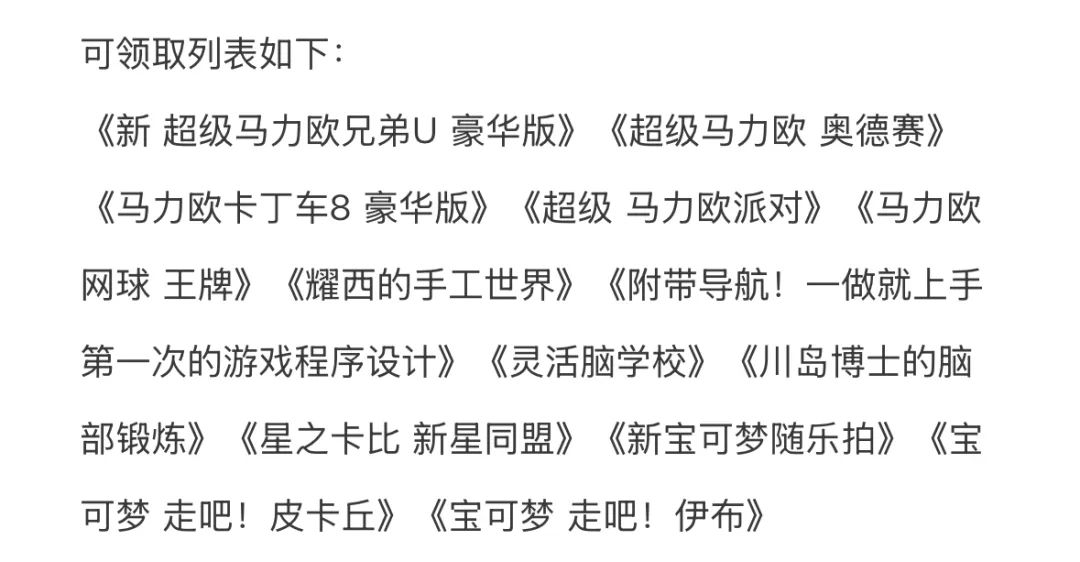 里面包含了多款马力欧、宝可梦等第一方大作,都选贵的也值个 1000 元左右(毕竟不送也没人买了)。