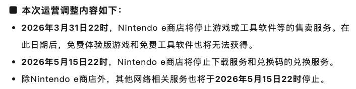 要点是 2026 年 5 月 15 日 22 时开始,玩家将无法通过 Nintendo e 商店下载软件了,国行玩家务必提前下载好游戏,同时在这之后游戏的联网功能也将无法使用。