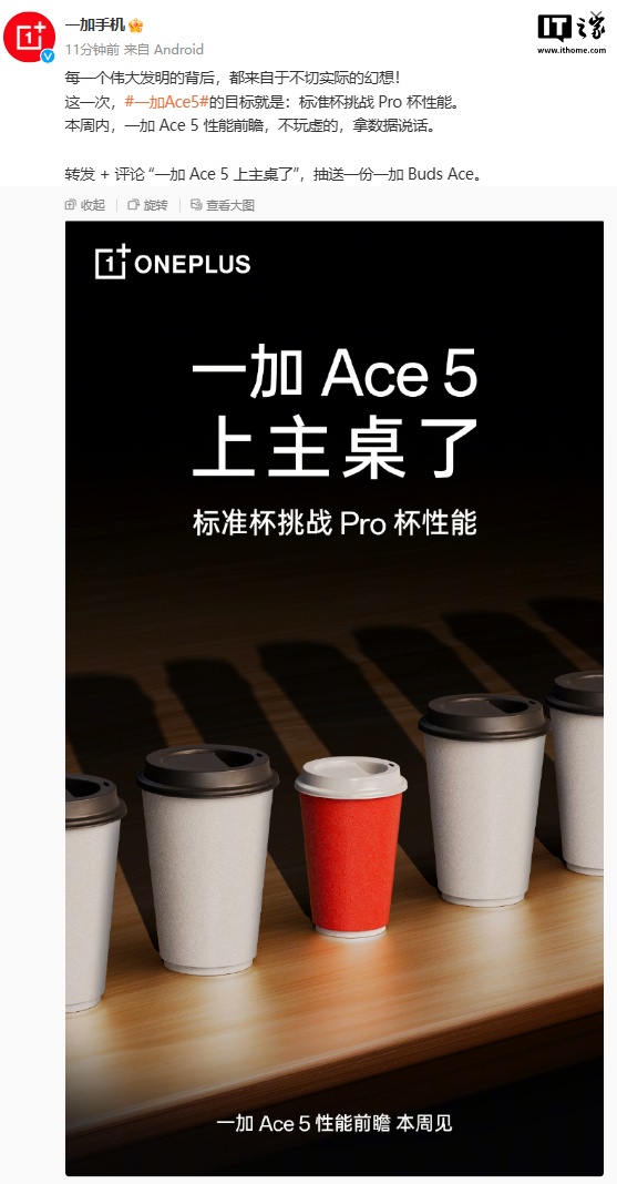 IT之家 12 月 2 日消息,一加手机今日官宣,一加 Ace 5“性能前瞻”本周见,目标“标准杯挑战 Pro 杯性能”。
