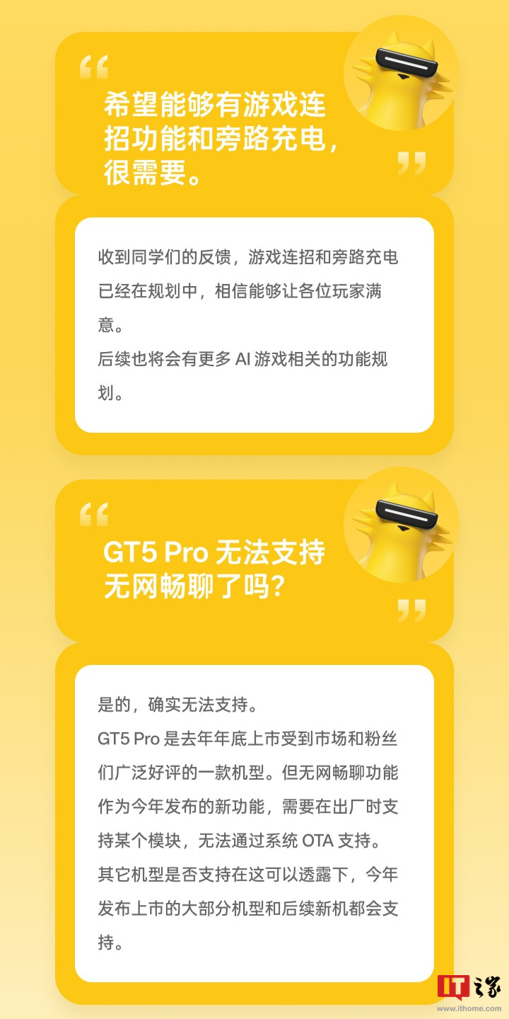 GT5Pro 是去年年底上市受到市场和粉丝们广泛好评的一款机型。但无网畅聊功能作为今年发布的新功能,需要在出厂时支持某个模块,无法通过系统 OTA 支持。