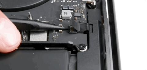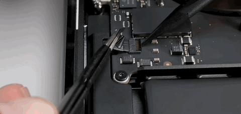触控板和主板的连接就只有这一根柔性电缆,虽说看起来触控板和主板以及电池拆卸的关系不大,但在 MacBook 里,先拆触控板非常重要,等到最后拆卸电池的时候,就会知道为什么得从这里下手。