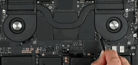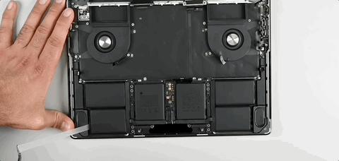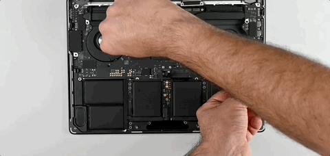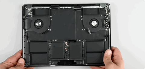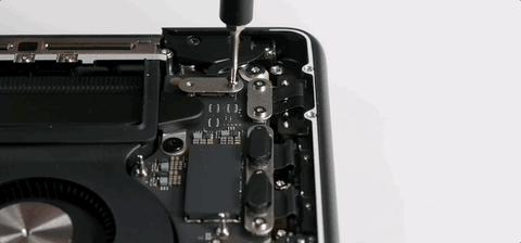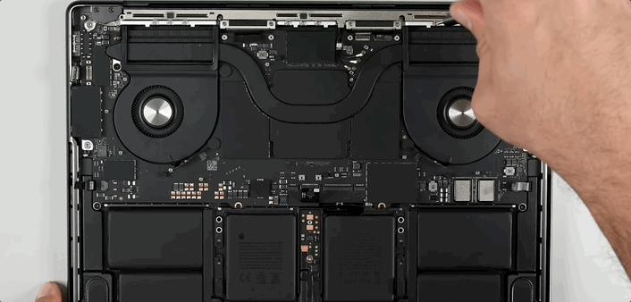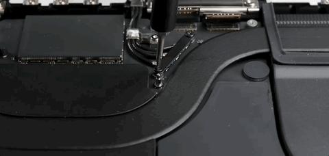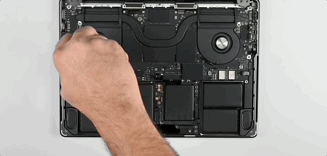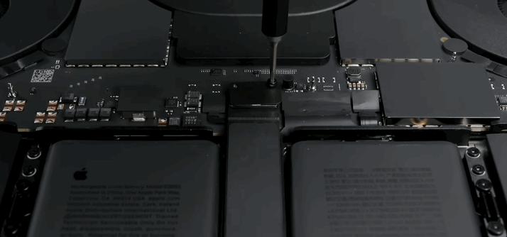 但想要把这个最占地方的大家伙拆下来,往往不是第一步,有时候为了把电池拆出来,甚至都快把其他的零部件取完了,才能轮到它,而在全新 MacBook Pro 上也不例外。
