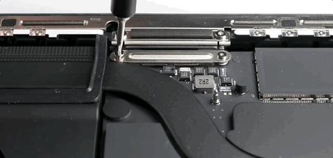 iFixit 从触控板的柔性电缆作为入手点,并且把电池管理系统的数据线也一并拔出,不过想要在 MacBook 里拔出一个连接线,不是一件特别简单的事情,倒不是说有什么特殊的手法和技术含量,而是你几乎会在每一个需要拔出的接口处,看见一个用螺丝固定的金属保护垫片。