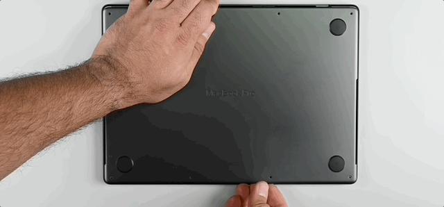 MacBook 的拆解还是熟悉的配方,从底部背板开始,依次拧下八颗五角钉螺丝,相比于其他需要从屏幕拆的产品来说,从非屏幕区动手有更大的安全保障,避免了力度把握不好而损伤屏幕的风险。