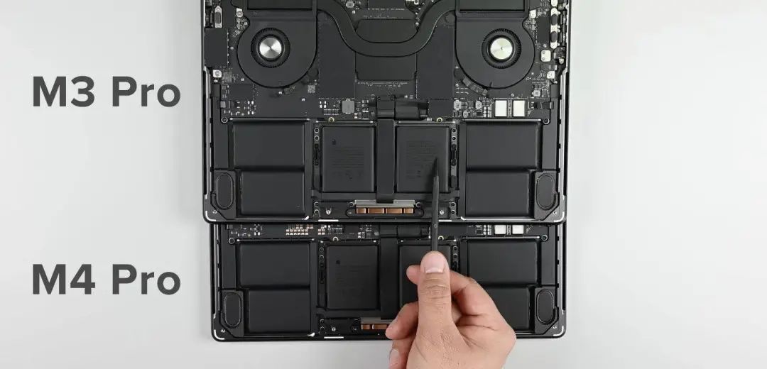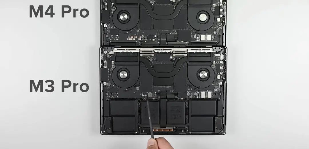 MacBook 的拆解非常解压,因为拆下背板后,眼见之处就是所有,没有太多隐藏起来的结构和元件,所以可以直接和上代搭载 M3 芯片的机型对比。