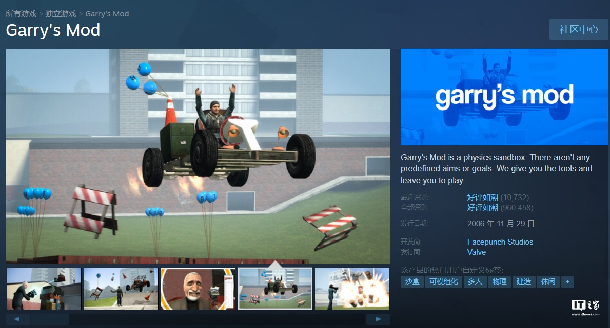 IT之家 12 月 2 日消息,《盖瑞模组(Garry's Mod)》是一款由 Facepunch Studios 制作 Valve 发行的沙盒游戏,与普通游戏不同,这款游戏并没有预定的目标或目的。游戏给了玩家工具,玩家可以自行决定游戏内容。