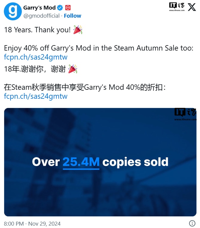 《盖瑞模组》官方 11 月 29 日宣布,该游戏自从 2006 年通过 Steam 在 PC 上销售以来,销量已经超过 2540 万份。
