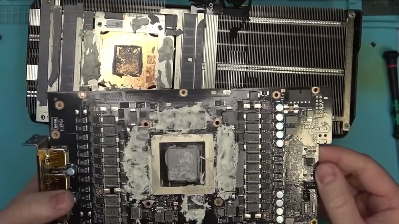 拆掉背板和散热器,可以发现GPU和显存芯片都覆盖了多得过分的散热硅脂,几乎都看不到本体了,半天才清理干净。