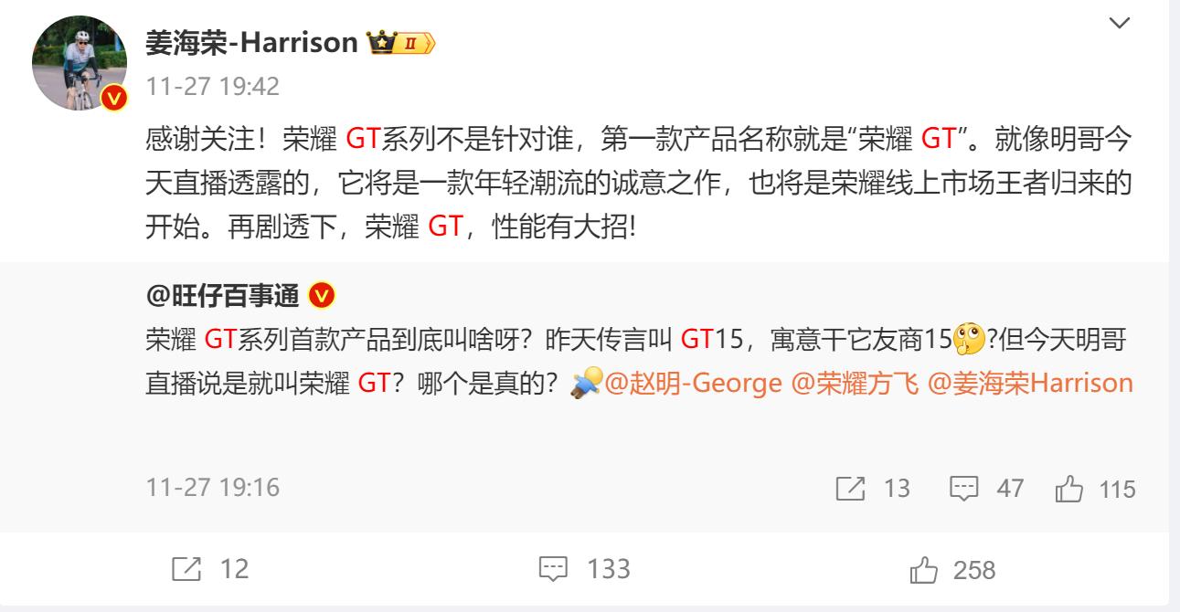 除了荣耀300系列,荣耀全新GT系列也有望在12月面世。按照荣耀终端有限公司中国区CMO姜海荣的说法,荣耀GT系列不同于以往的荣耀X50 GT、荣耀80 GT、荣耀90 GT等机型,是全新的一个系列,主打线上市场,性能方面有大招。