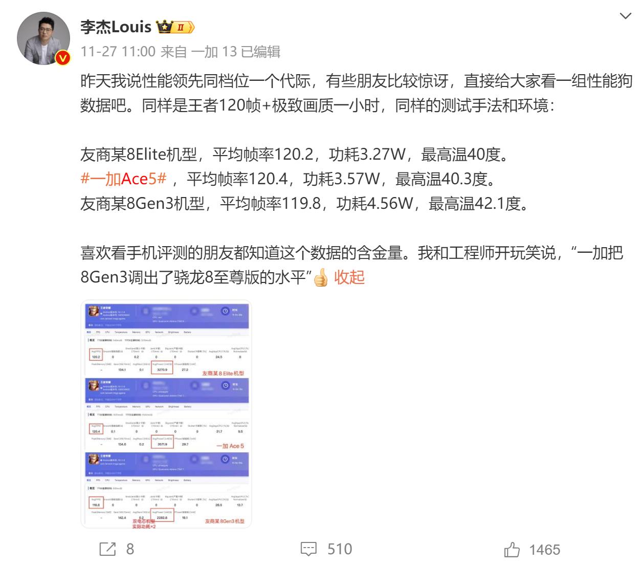 结合一加中国区总裁李杰公布的信息可知,一加Ace 5系列搭载高通上一代旗舰处理器骁龙8 Gen 3,并且通过调校将其功耗、发热、游戏帧率均提升至骁龙8至尊版同等水平。