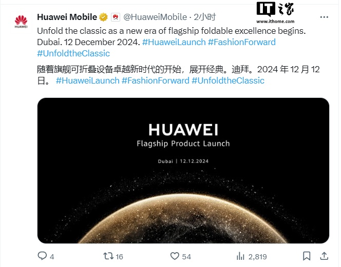 IT之家注意到,华为今天在其全球 X 平台的官方账号上分享了一张海报,该海报与 11 月 26 日在中国举办的“华为 Mate 品牌盛典”的巨型海报相同。华为还写道:“开启经典新纪元,旗舰折叠手机卓越新征程由此展开。迪拜。2024 年 12 月 12 日。#华为新品发布 #时尚前沿 #开启经典”