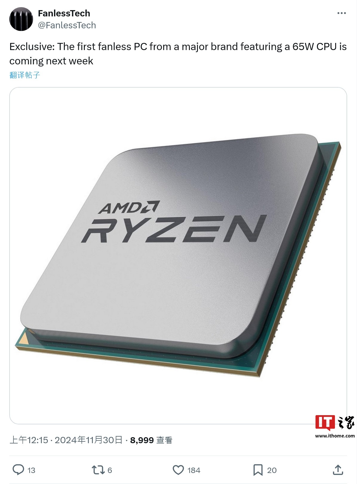 IT之家 12 月 2 日消息,外媒 FanlessTech 官方账户上周(11 月 30 日)在 X 平台表示,当时的下周(IT之家注:即目前的本周)将首次有“大厂”推出配备 65W 标称功耗处理器的无风扇台式电脑。