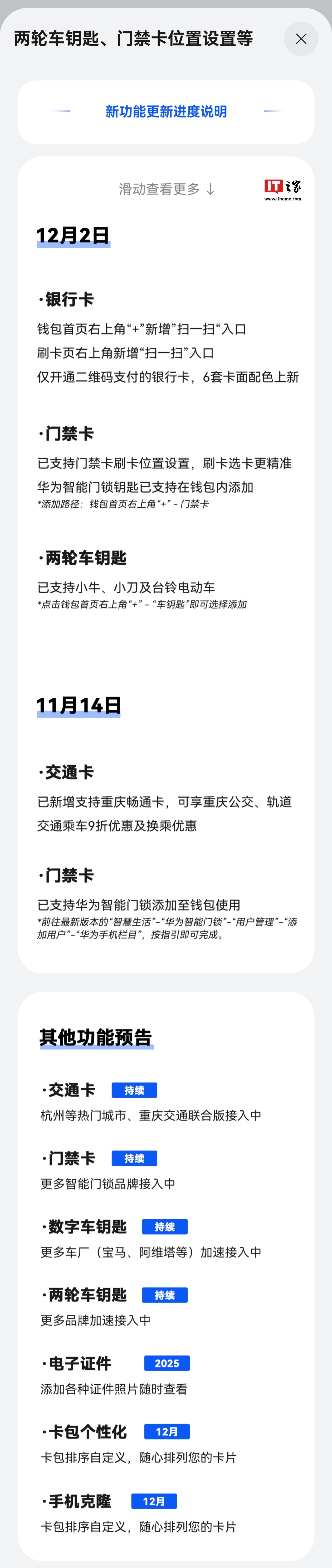 此外,纯血鸿蒙版华为钱包 App 内还发布了新功能进展说明及其他功能预告,IT之家附详情如下: