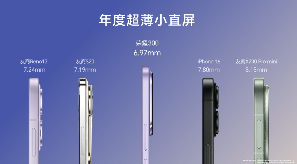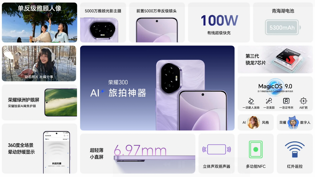 其中荣耀 300 主打“超薄小直屏”设计(6.97mm);荣耀 300 Pro 主打正面曲屏与背部曲线的“双曲”设计,搭配旷野舷窗摄像头模组。