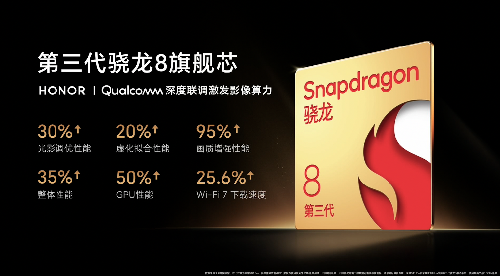 而在规格方面,荣耀 300 Pro 搭载高通骁龙 8 Gen 3 处理器,Pro 机型支持 Wi-Fi 7 技术,Ultra 型号内置 AI 驭光引擎,同时还支持卫星通信。