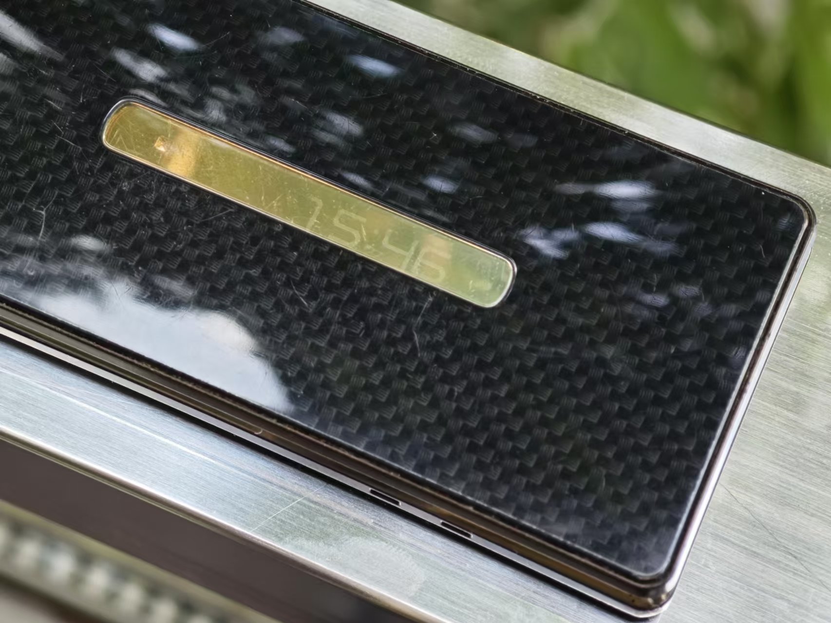 合上翻盖,或是按压右侧按钮,就可以点亮这块小副屏,预设的三种显示方式,分别为仅时钟、时钟与电量、日历时钟与电量;有来电或者有通知时副屏也会亮起,显示对应的发信人或是联络人。