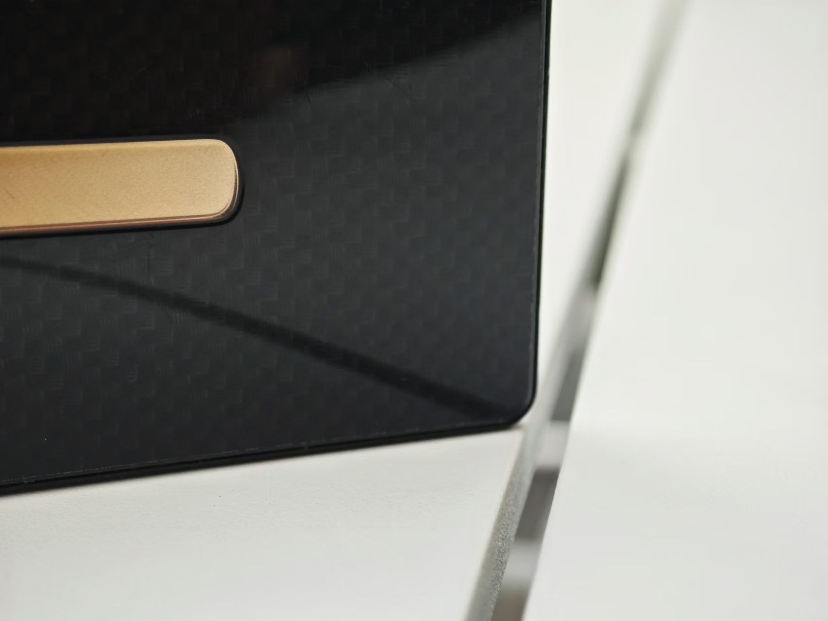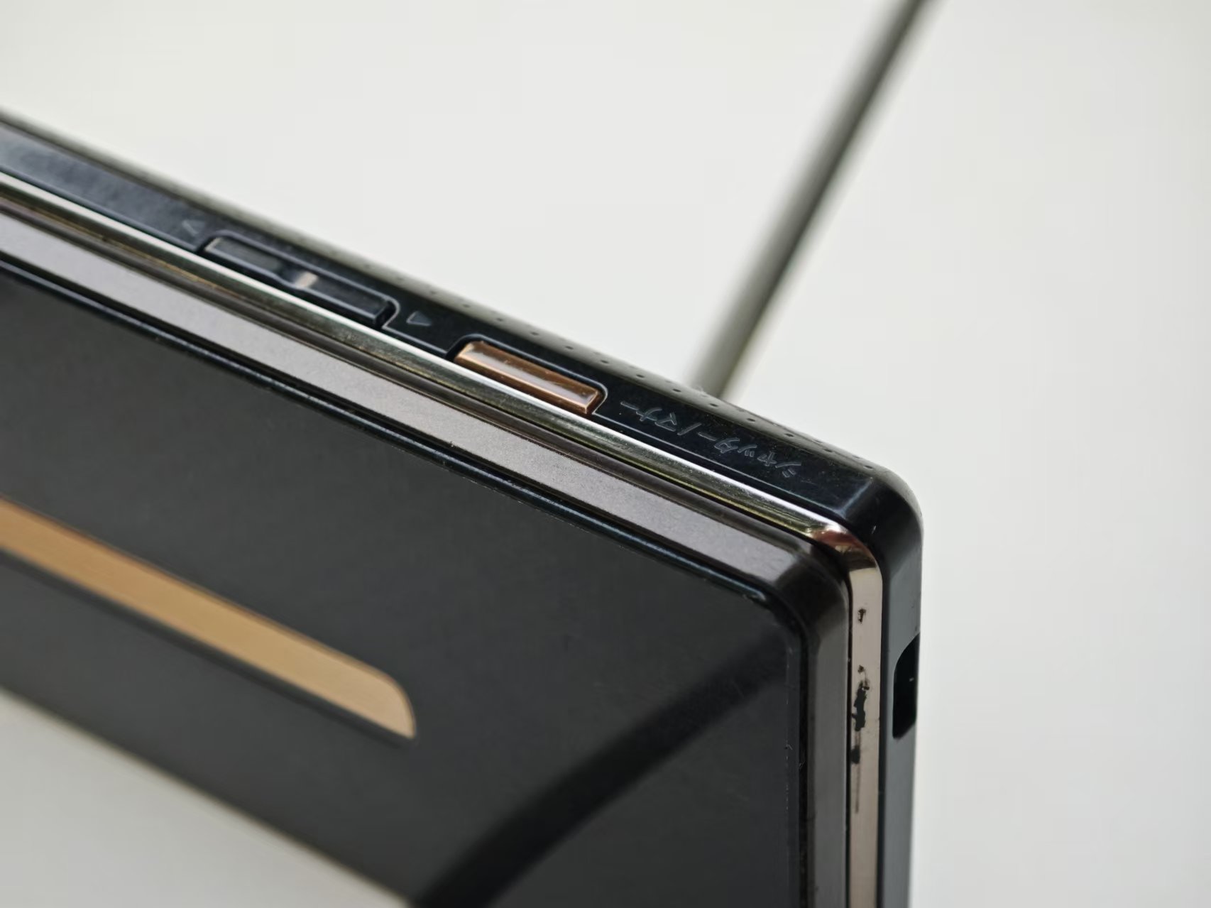作为夏普初代半智能翻盖机,SHF31总共有红、白、黑三种配色。我手上这一台是黑色的,黑金相间的产品配色,为这款产品注入了一丝沉稳的商务气质,独特的格纹印花则是进一步强调了这一点。