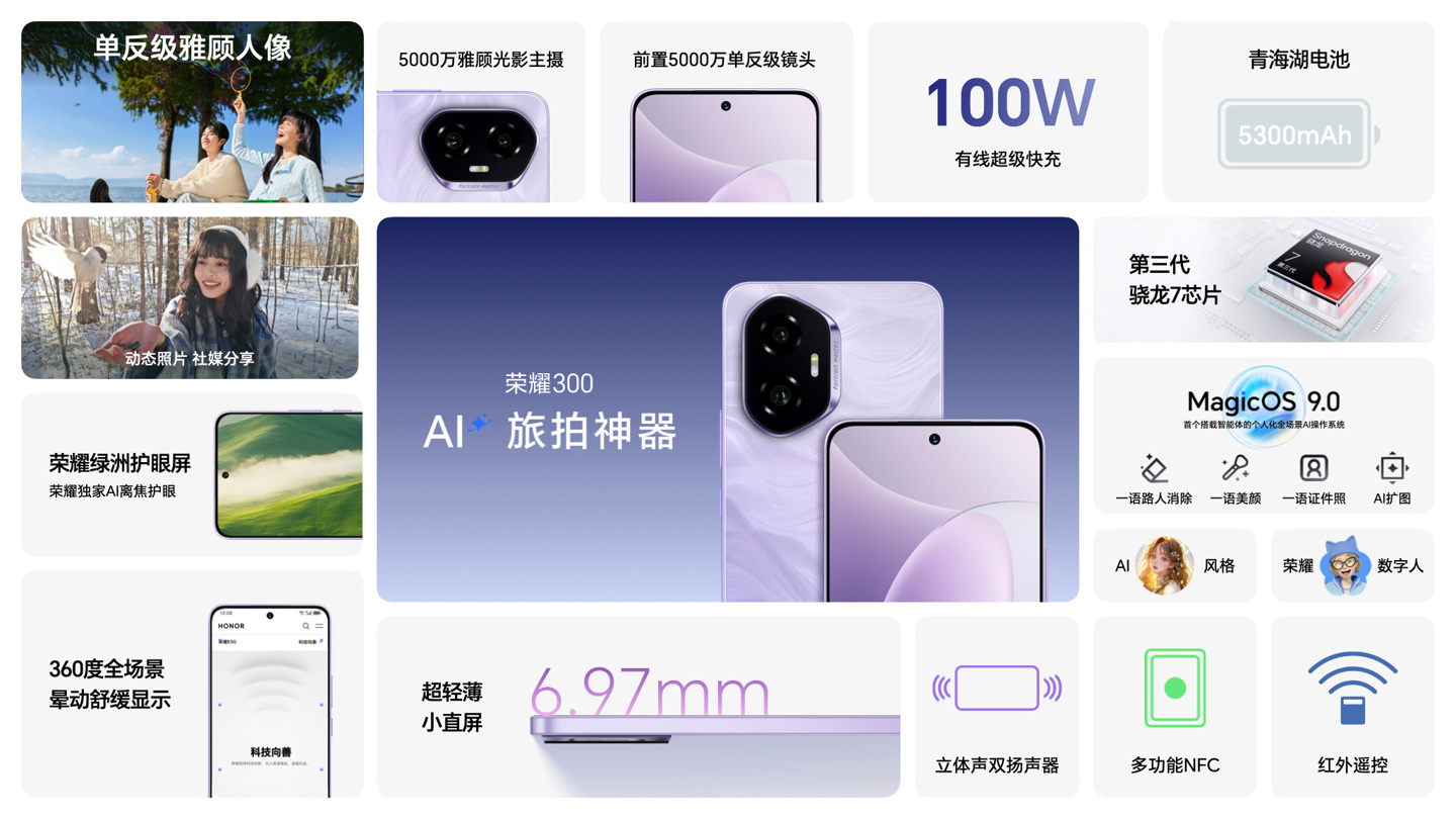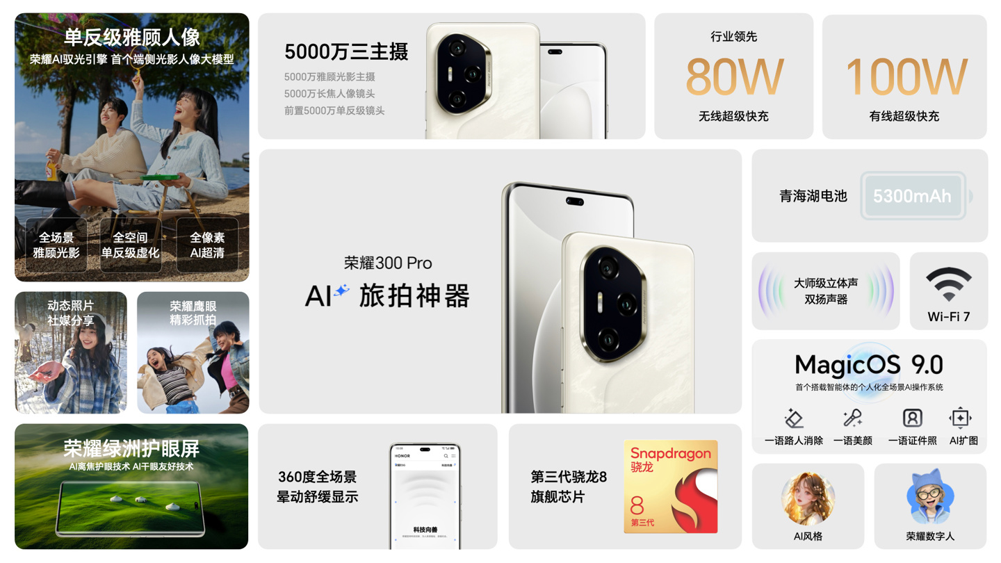 荣耀 300 系列新机还预装 MagicOS 9.0 系统,支持 YOYO 智能体、AI 修图(扩图、消除、闭眼修复、路人消除等)、灵动胶囊、荣耀任意门等功能。