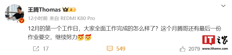 小米中国区市场部副总经理、REDMI 品牌总经理王腾今日也发文称“这个月还有最后一份作业要交”。结合两人的微博内容来看,预计小米 REDMI 品牌本月还将带来一波新品。