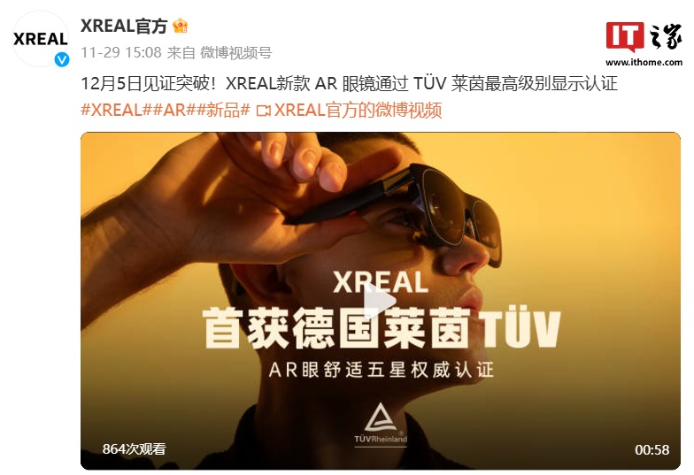 IT之家 12 月 2 日消息,XREAL 新品发布会已官宣定档 12 月 5 日 14:00,根据官方预热信息来看,新款 AR 眼镜通过了 TÜV 莱茵最高级别显示认证。
