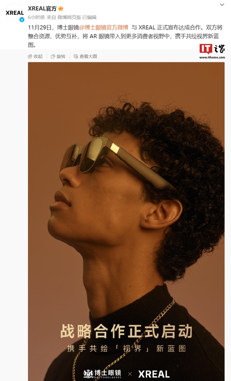 IT之家注意到,XREAL 官方今日还发文透露,已于 11 月 29 日同博士眼镜达成战略合作,博士眼镜将成为 XREAL 的深度合作伙伴,在全国 100 家门店开展产品销售和品牌推广,同时还将提供配镜服务。