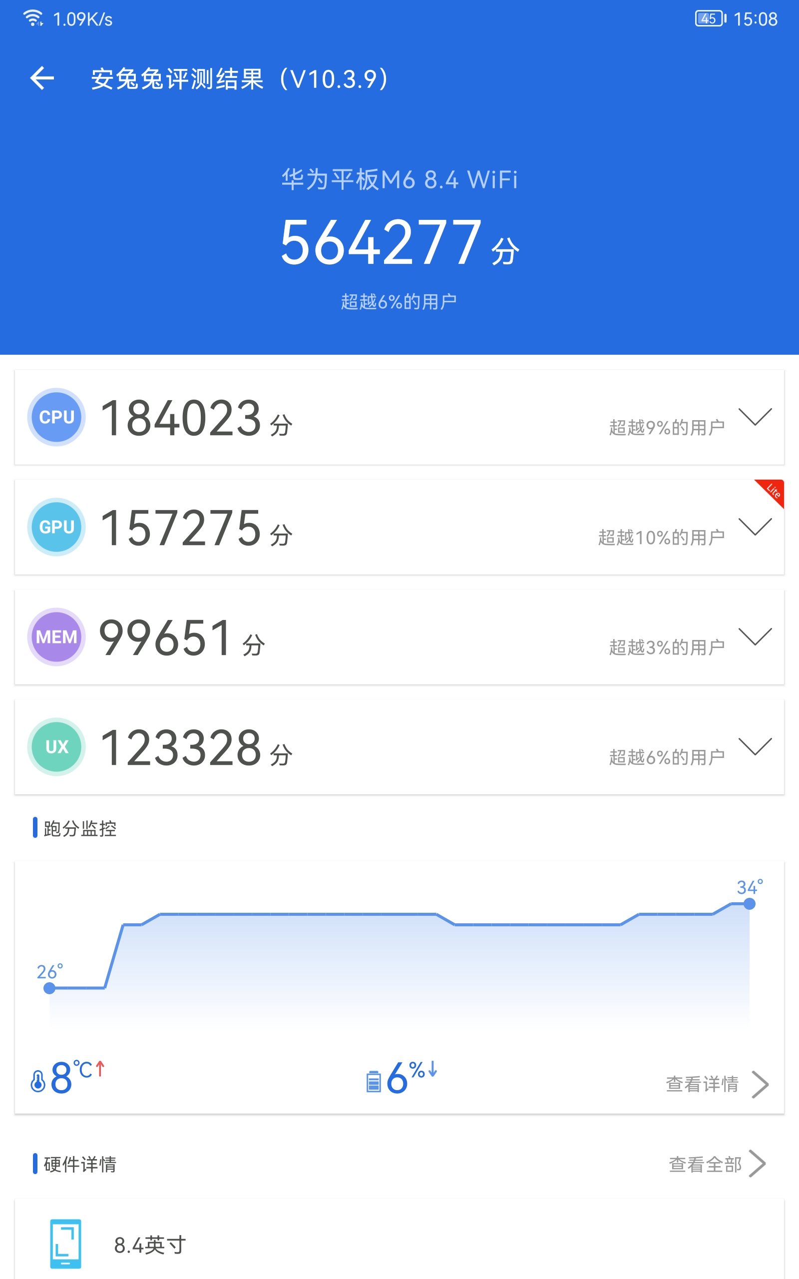华为M6安兔兔跑分为565277分,相较于许多百元新平板,这个分数其实是比较高的。例如当前京东售价879元的掌玩mini 2,搭载联发科G99芯片,官方宣称跑分40万+;荣耀X9平板所搭载的骁龙680芯片,安兔兔跑分不到30万分。
