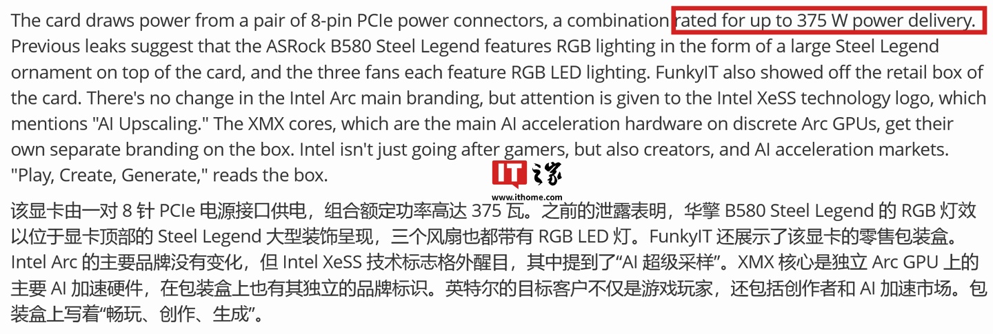 英特尔的目标客户不仅是游戏玩家,从包装盒上的“畅玩、创作、生成”标语,可以看到该显卡也适用于内容创作者以及各种 AI 场景。