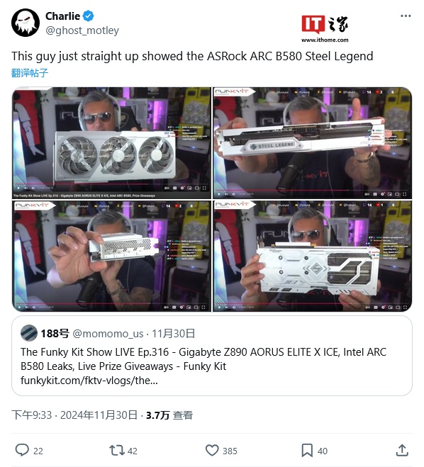 IT之家 12 月 3 日消息,消息源 FunkyIT 于 11 月 30 日发布视频,分享了华擎(ASRock)锐炫(Arc)B580 Steel Legend 12 GB “Battlemage”显卡,揭示了其外观设计、散热方案和主要功能。