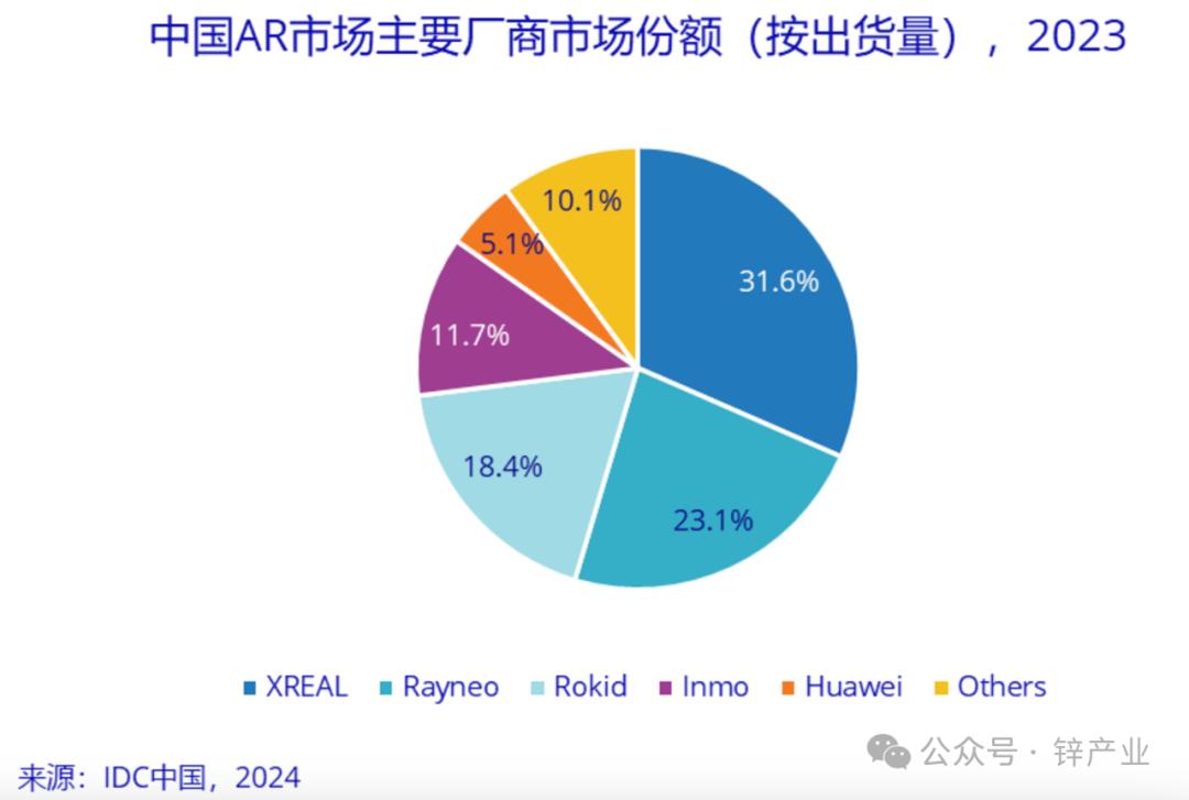 据IDC公布的统计数据显示,2023年,中国AR市场出货26.1万台,Xreal、Rokid、INMO、雷鸟创新四家占据了超80%市场份额。