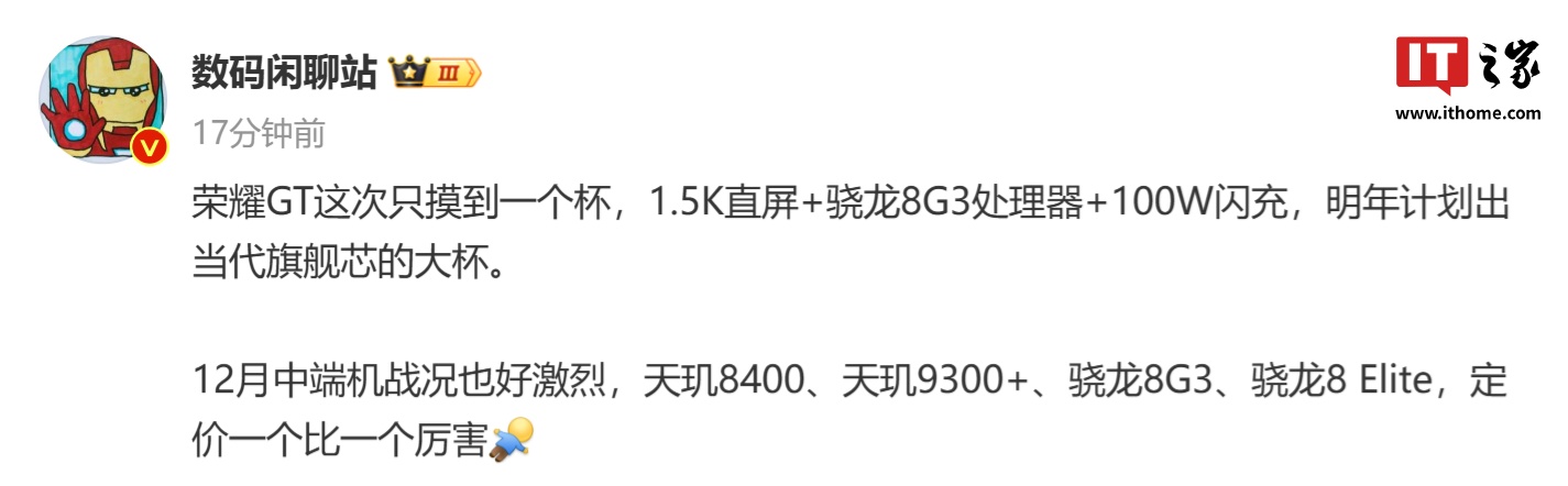 IT之家 12 月 3 日消息,博主 @数码闲聊站 今日透露,“荣耀 GT 这次只摸到一个杯,1.5K 直屏 + 骁龙 8G3 处理器 + 100W 闪充,明年计划出当代旗舰芯的大杯。”