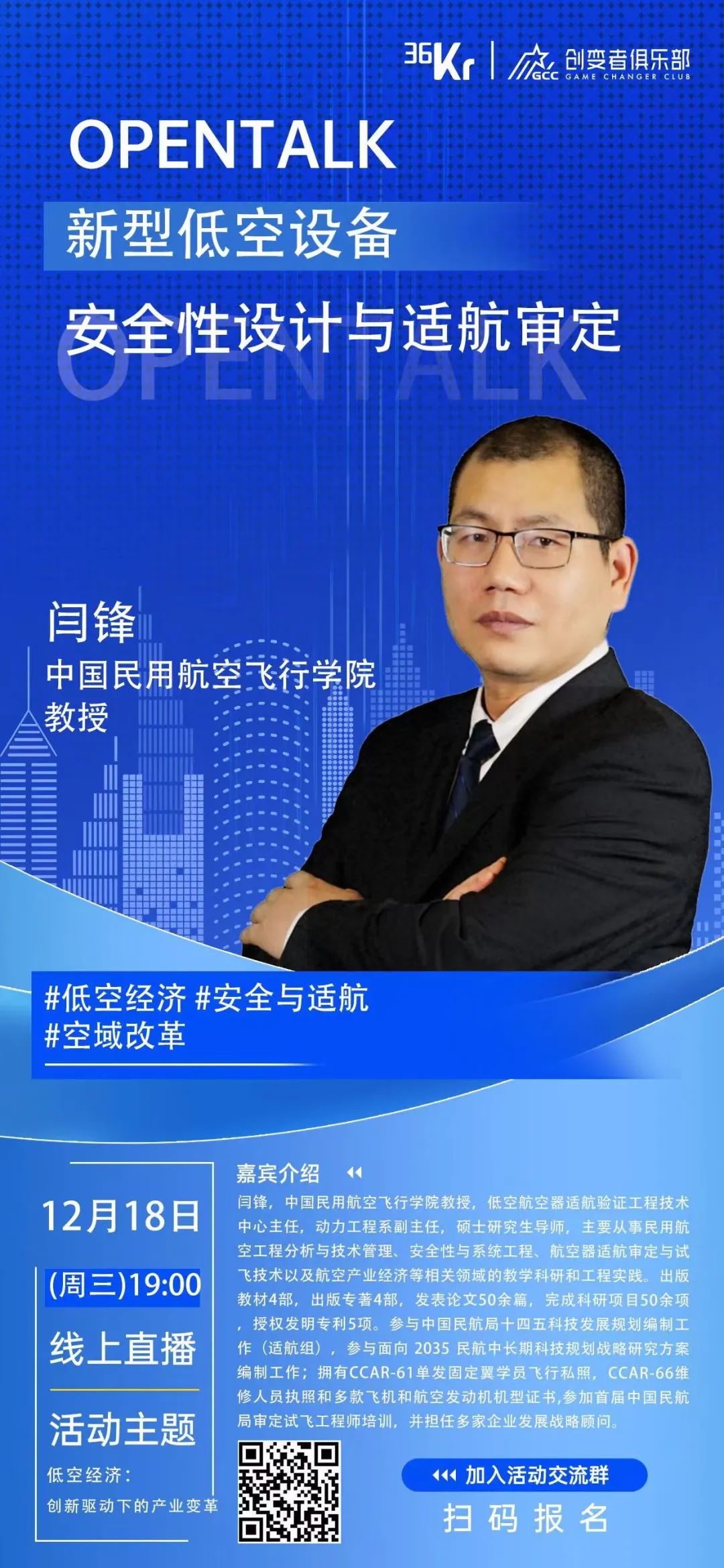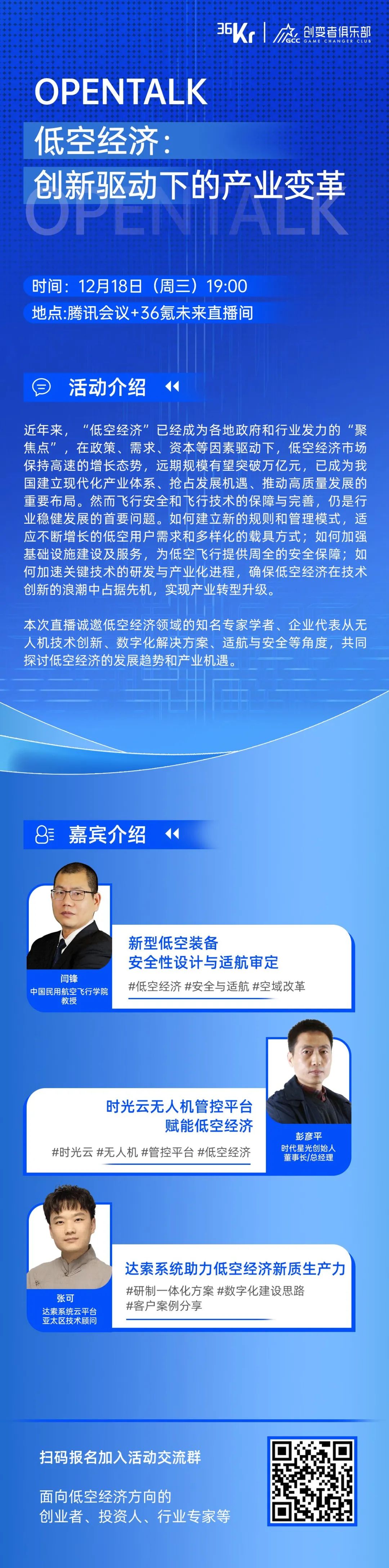 欢迎关注低空经济的创业者、投资人及从业者扫描下方活动海报二维码报名,参与和三位嘉宾的共同探讨。