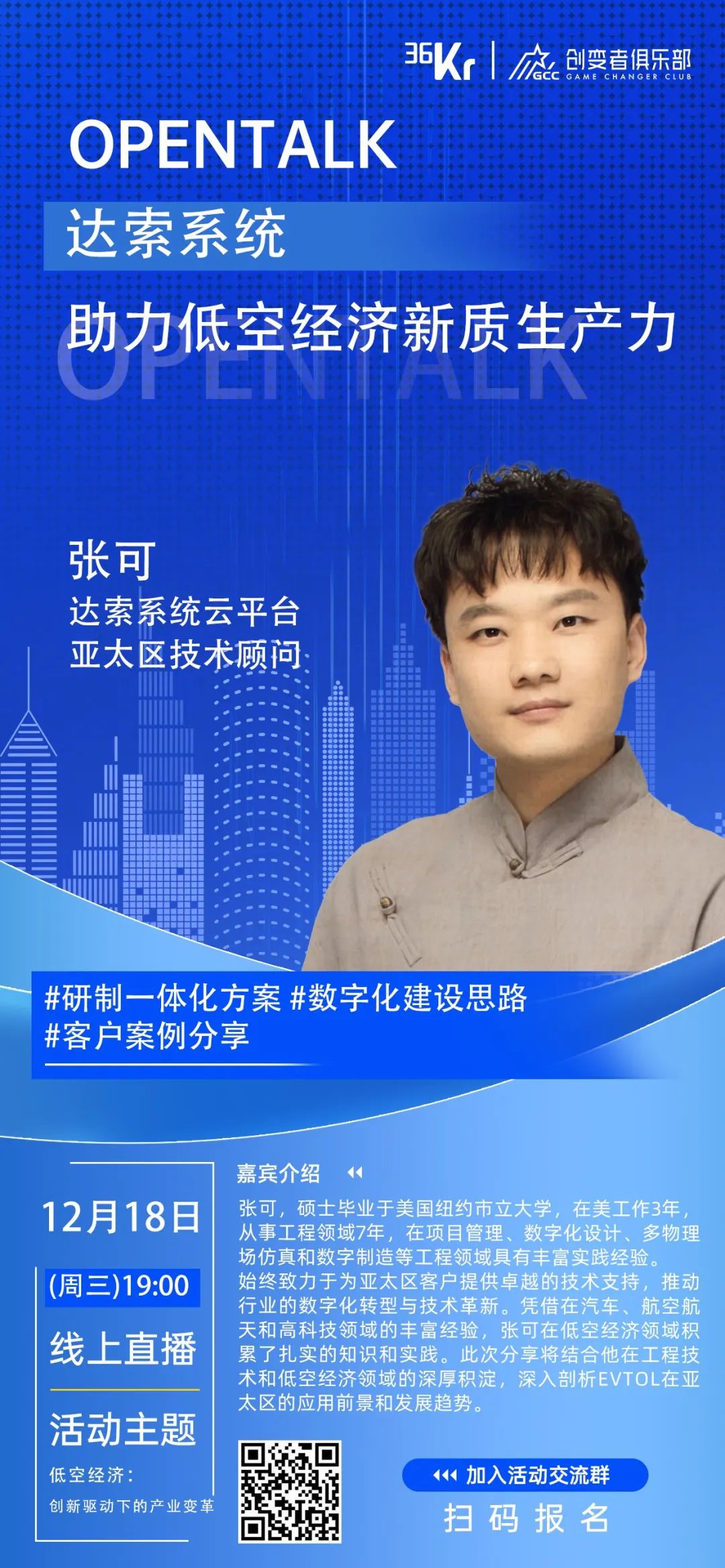 本次直播诚邀中国民用航空飞行学院教授闫峰、时代星光创始人董事长/总经理彭彦平、达索系统云平台亚太区技术顾问张可从无人机技术创新、数字化解决方案、适航与安全等角度,共同探讨低空经济的发展趋势和产业机遇。
