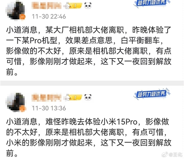 有博主称:“小道消息,难怪昨晚去体验小米15Pro,影像做的不太好,原来是相机部大佬离职,有点可惜小米的影像刚刚才做起来,这下又一夜回到解放前。”