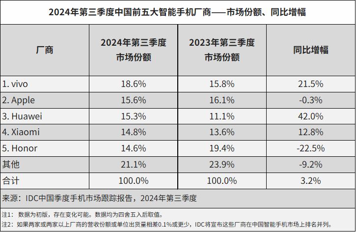 二季度跌出中国市场前五,一雪前耻的第三季度,苹果在中国市场重回第二,这无疑依赖于 iPhone 16 系列产品的带动。纵观整个手机市场,今年三季度的中国智能手机出货量同比增长了 3.2%,但苹果的出货量同比是下降了 0.3%。