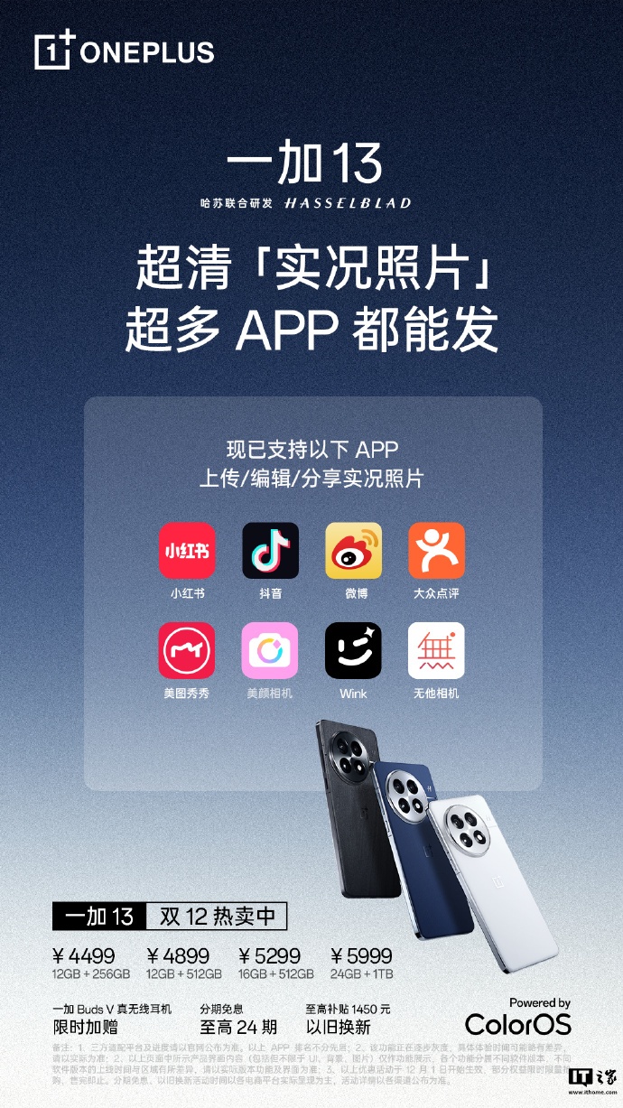 IT之家 12 月 3 日消息,一加手机今日官宣,一加 13 现已支持微博、小红书、抖音、大众点评、美图秀秀、美颜相机等多款 App 分享“实况照片”。