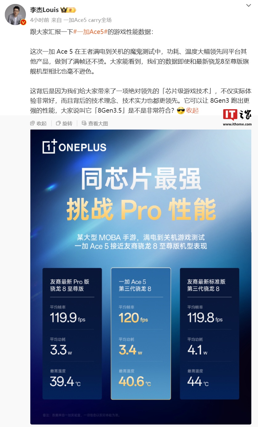 一加中国区总裁李杰今日发文公布了一加 Ace 5 手机的游戏性能数据,他称新机“在王者满电到关机的魔鬼测试中,功耗、温度大幅领先同平台其他产品,做到了满帧还不烫。”