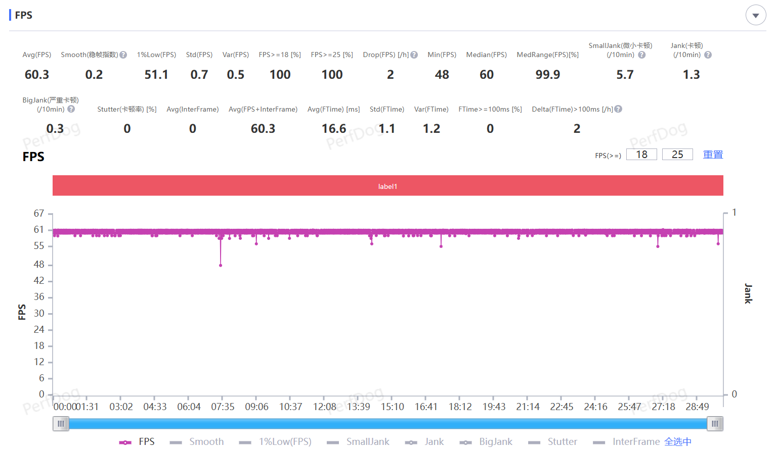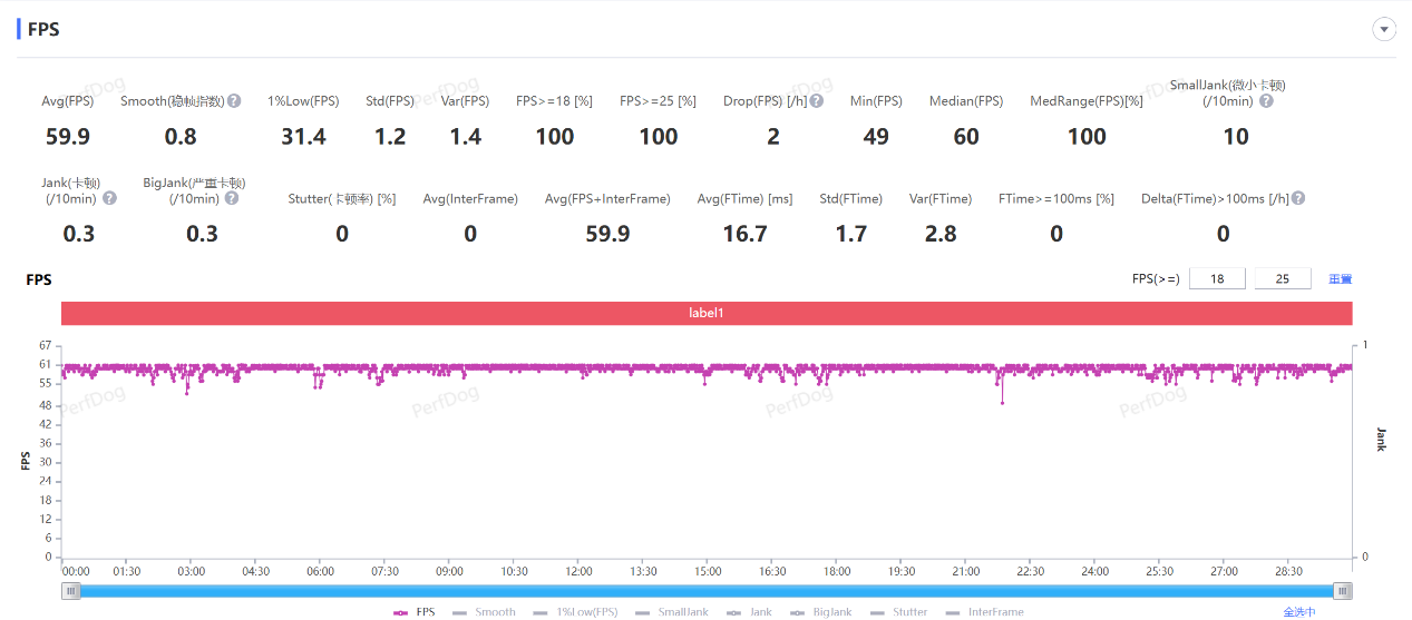 30 分钟光映广场 30 跑图后。《绝区零》的游戏帧率波动确实要比前面两款游戏都要大,但最终平均帧数也达到了 59.9 帧。