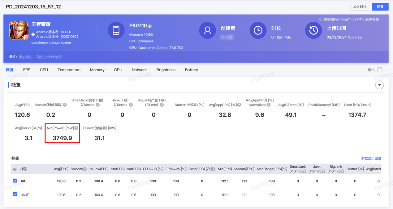 由于《王者荣耀》每局结束后脱离游戏地图时帧数会直接掉回 60 帧,对记录结果造成干扰,所以我们只记录对局中的实时帧率。从战绩图时间上看,同一天测试的 6 局对战实际游戏时间已经超过了 1 小时。