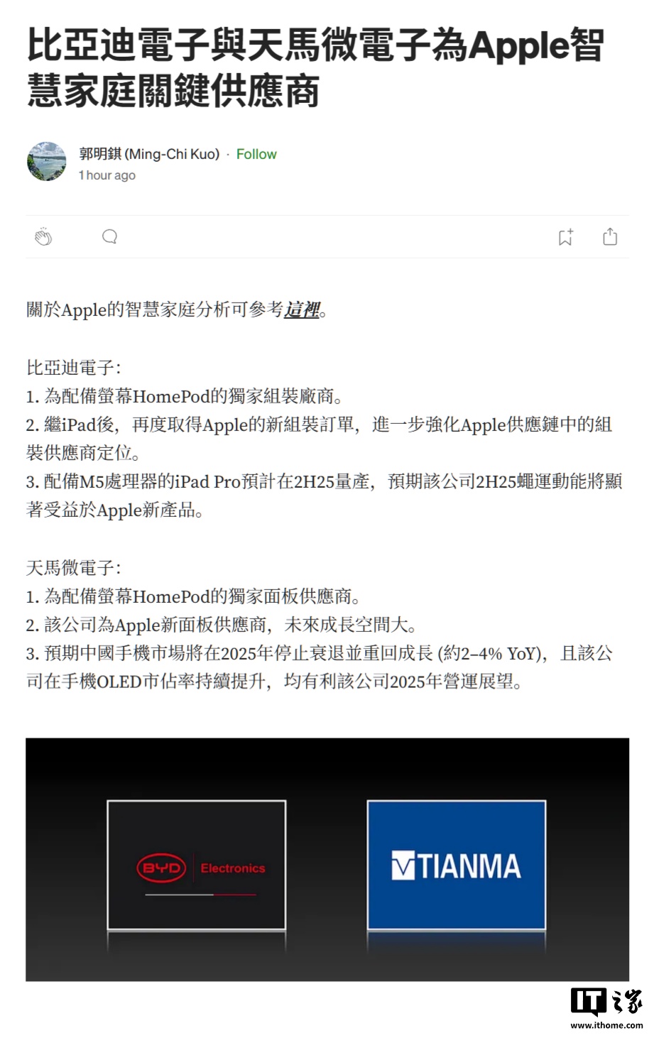 IT之家获悉,郭明錤认为比亚迪电子及天马微电子将成为苹果智能家居的关键供应商。
