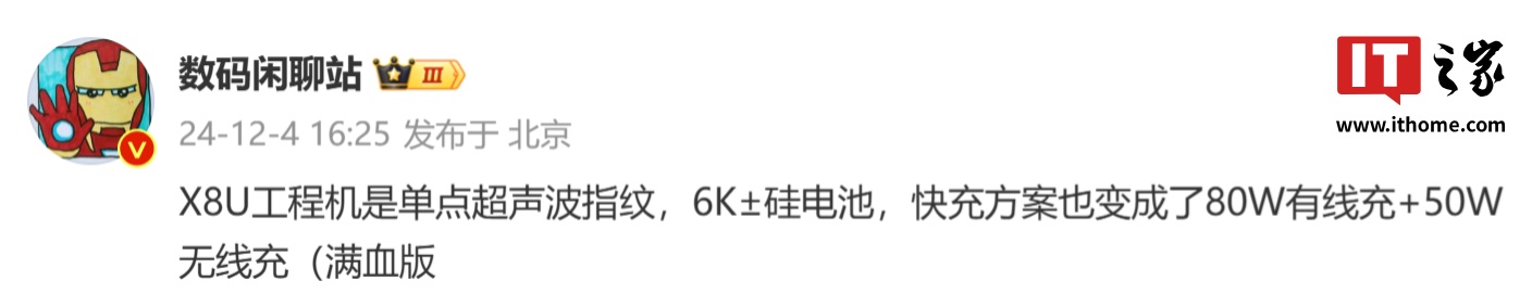 IT之家 12 月 4 日消息,博主 @数码闲聊站 今日透露,OPPO Find X8 Ultra 工程机是单点超声波指纹,6K± 硅电池,快充方案也变成了 80W 有线充 + 50W 无线充(满血版)。
