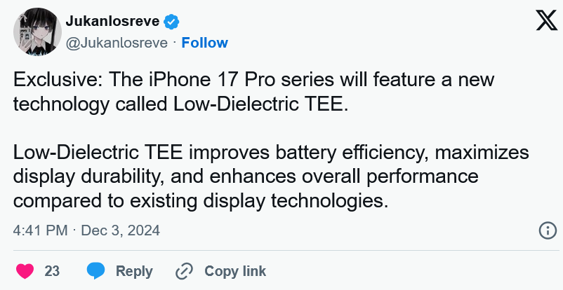 现在,社交媒体平台 X(原 Twitter)上的爆料人 Jukanlosreve 又爆出了一条新的传闻,称苹果可能会在 iPhone 17 Pro 机型中引入新的显示技术。 如果消息属实,那么苹果可能会放弃当前的 LTPO(低温多晶氧化物)显示面板,转而采用一种名为 Low-Dielectric TEE 的新型显示技术。 这项技术很可能指的是位于 OLED 面板下方的印刷电路板,带来的低介电常数也意味着更省电。