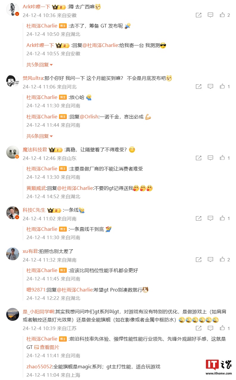 荣耀 GT 系列产品经理 @杜雨泽Charlie 还在微博评论区中回复了部分网友的问题:针对个人行程安排是否去广西,他回复称“去不了,筹备 GT 发布呢”;针对这个月能不能买到,他表示“放心哈”;针对新机拍照水平,他称“应该比同档位性能手机都会更好”。