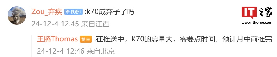 IT之家注意到,小米中国区市场部副总经理、REDMI 品牌总经理王腾今日在微博评论区回应网友表示:“在推送中,K70 的总量大,需要点时间,预计月中前推完。”