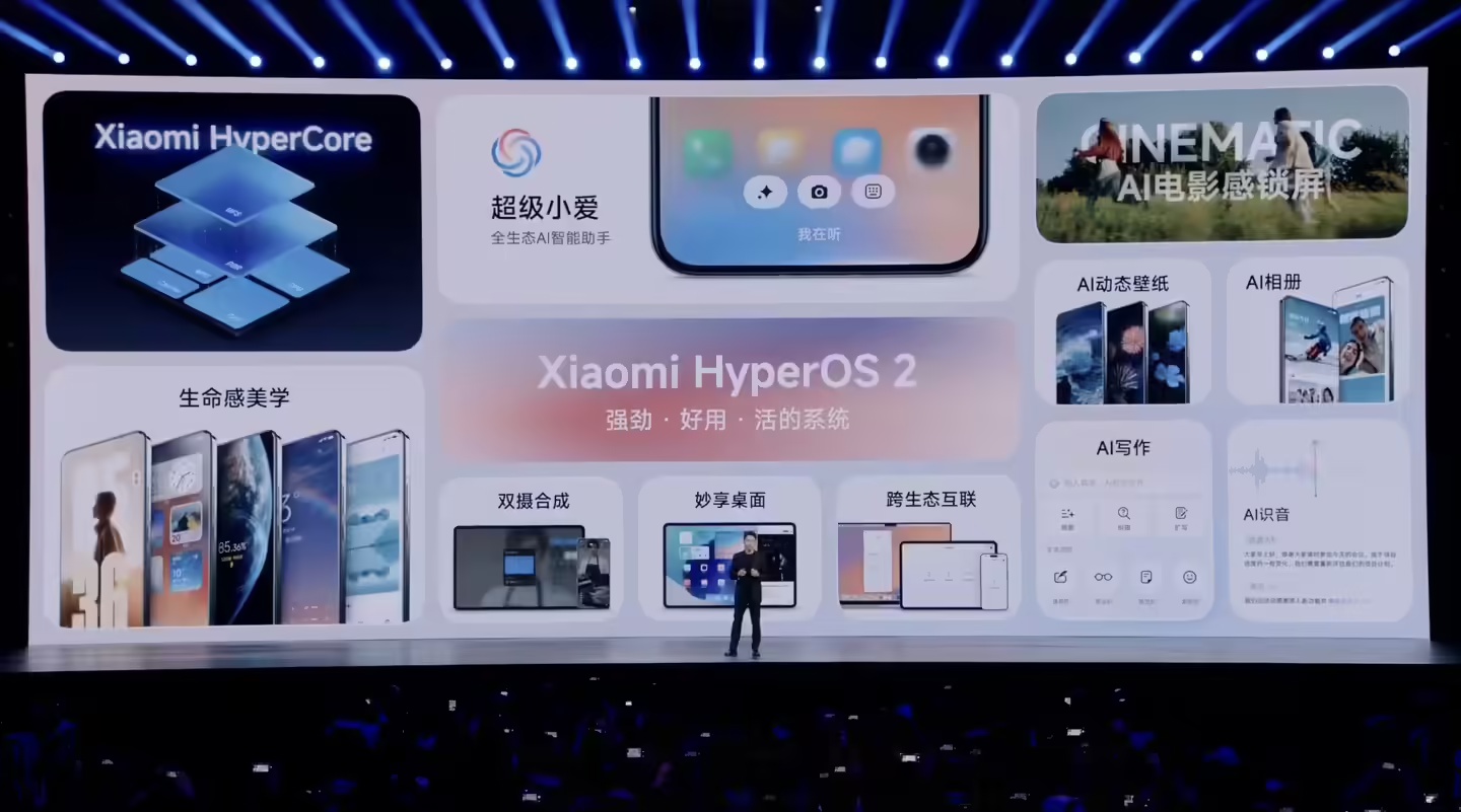 小米澎湃 HyperOS 2 系统发布于 10 月 29 日,采用自研微架构调度器,全面支持苹果生态(用户安装“小米互联服务”可实现文件图片互传等功能)。新系统内置超级小爱,支持 AI“电影感”锁屏时钟、壁纸生成、AI 图片重绘、备忘录录音、写作、翻译等功能。