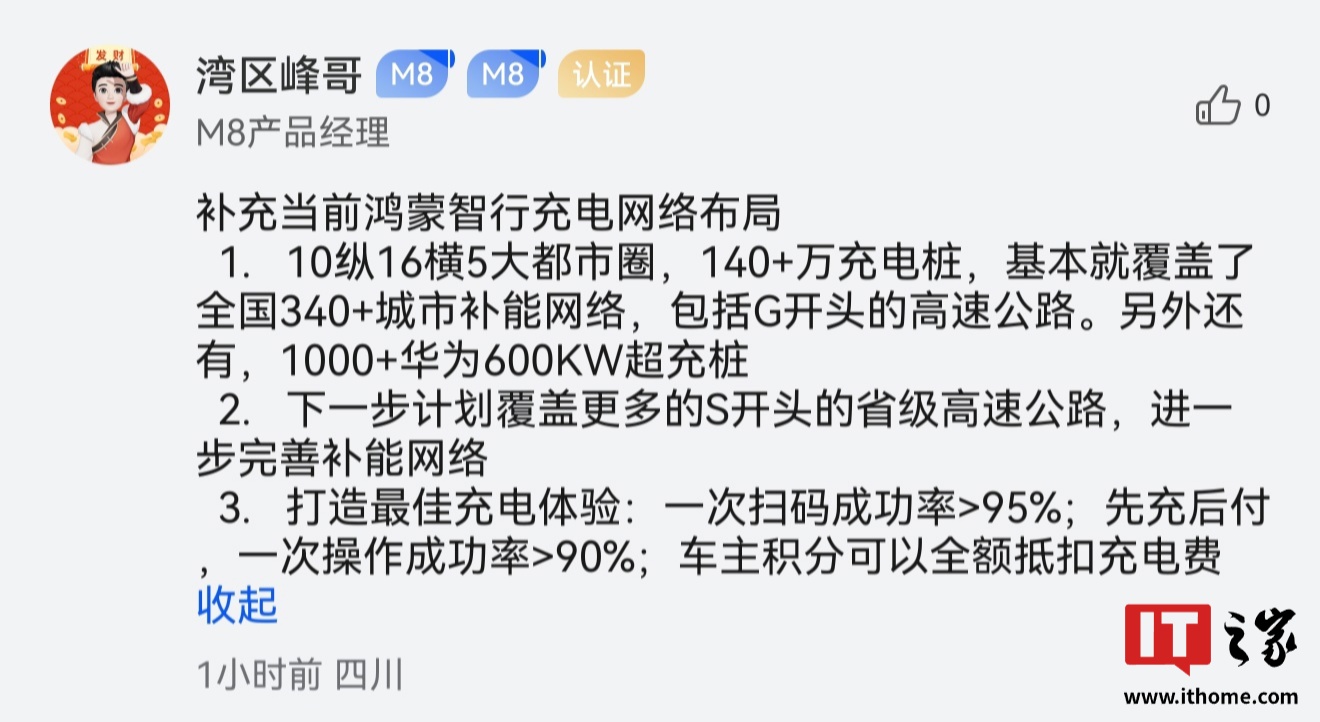 据IT之家此前报道,鸿蒙智行充电网络覆盖 10 纵 16 横 5 大都市圈,接入 140+ 万充电桩,基本覆盖全国 340+ 城市补能网络,包括 G 开头的高速公路。鸿蒙智行还接入了 1000+ 华为 600KW 超充桩,下一步计划覆盖更多的 S 开头的省级高速公路,进一步完善补能网络。
